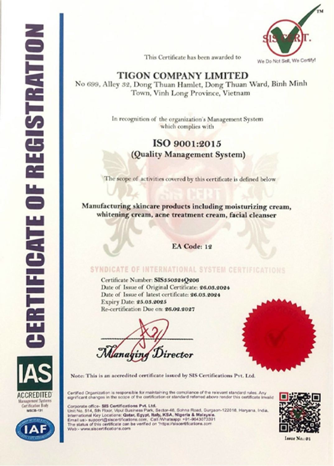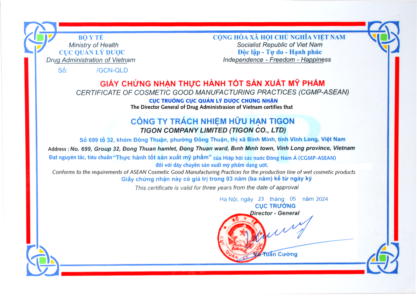 Đến đầu năm 2019 công ty đã nhận được giấy chứng nhận Thực hành tốt sản xuất mỹ phẩm CGMP - ASEAN. Đây cũng là bước tiến mới trong quá trình sản xuất sản phẩm tốt nhất và an toàn, nhằm đáp ứng tốt nhất cho người sử dụng sản phẩm thuộc CÔNG TY TNHH TIGON.